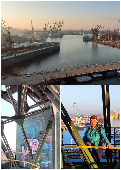 Ein Hafenkran, auf den man klettern darf. Dabei fühlt man sich, wie wenn man im Ruhrgebiet auf einen Hochofen steigt. Andere Kräne spiegeln sich im Wasser, in der Ferne hört man die Großstadt, die Sonne geht staubig unter.