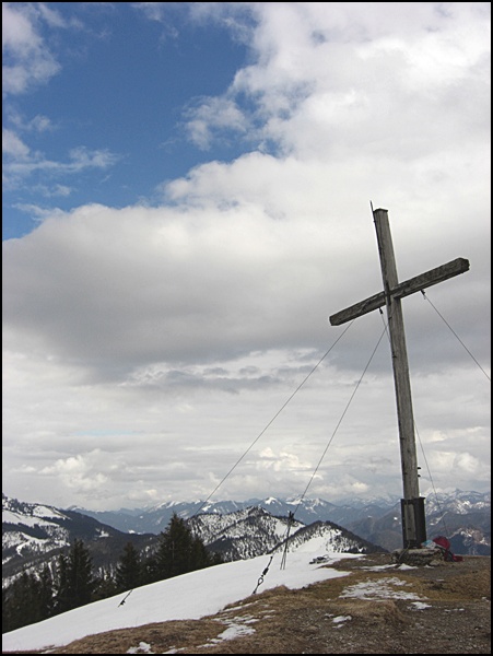 Mehrfache Freude am Gipfelkreuz: Sonne und blauer Himmel hier und da entschädigen für den frischen Wind, insgesamt ist es zwar grau und wolkig, die Aussicht dennoch toll, auch wenn ich mit dem Gipfel bestimmen nicht sehr erfolgreich bin heute. Walchensee, Starnberger See, Ammersee sind gut zu erkennen und rundherum im Alpenvorland: kein Schnee mehr! Grün und braun, nicht mehr weiß!