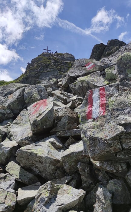 Am Wildsee beginnt der Aufstieg zum Gipfel, der Weg ist gut erkennbar und meist leicht zu gehen, an manchen Geröllstellen ist Trittsicherheit notwendig. Ca 500 m oberhalb des Wildsees kommt man zum Grat, wo es rechts zur Hinteren Großwandspitze geht und links die letzten Meter zum wunderschönen, schlichten Gipfelkreuz der Glöcknerin. Und dort beginnt das zauberhafte Gipfel-Bennennungs-Spiel mit der Handvoll Leute, die den sonnigen, windstillen Tag genießt. Dachstein, Hochkönig, Steinernes Meer… Ankogel, Hochalmspitze, Hoher Sonnblick, die Pyramide des Großen Wiesbachhorns und unverkennbar der Großglockner.