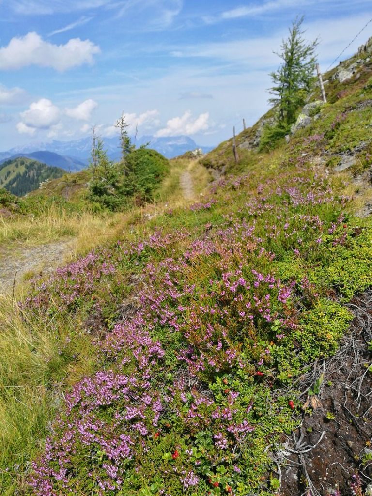 Der Weg führt recht einsam an einem gluckernden Bach entlang und über saftig grüne Almwiesen, nicht allzu steil. Überall blüht es, in allen Farben, wie schön und bunt doch der Sommer auf einer Bergwiese ist!