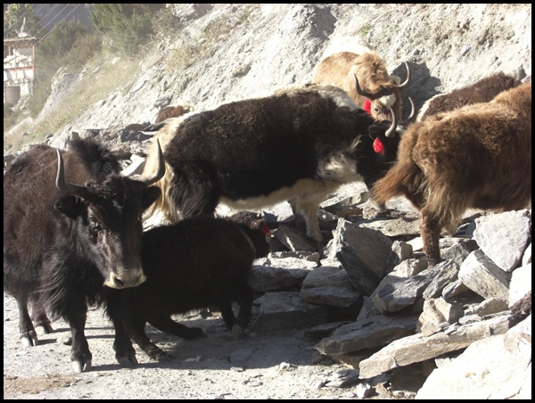 Ruhe und Erholung stehen heute an. Wir wandern frühzeitig wie immer los, gegen halb 8, also noch vor allen anderen Wanderern, die erst von Manang noch heraufkommen mussten. Mit dem rechtzeitigen Abmarsch wollen wir sicher gehen, in Yak Kharka einen Schlafplatz zu bekommen. Yak Kharka liegt auf 4.020m, viele Dörfer gibt es hier nicht und es ist wichtig, nicht zu viele Höhenmeter zwischen diese beiden Schlafplätze zu bekommen. Die Gegend ist bekannt für die Yaks überall, der Name Yak Kharka bedeutet Yak-Weide. Nur leider bekommen wir kaum welche zu Gesicht, da sie alle auf „Urlaub“ in Manang sind, um dort die Reste auf den abgeernteten Buchweizen-Feldern abzufressen. Dafür begegnen uns Blaue Schafe, die aber gar nicht blau sind.