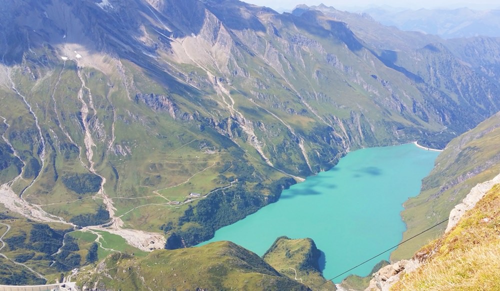 Der Blick beim Abstieg ist herrlich, tief unter uns leuchtend blau die Stauseen, davor winzig, auf dem einzigen flachen Stück weit und breit, das Schwaiger-Haus.